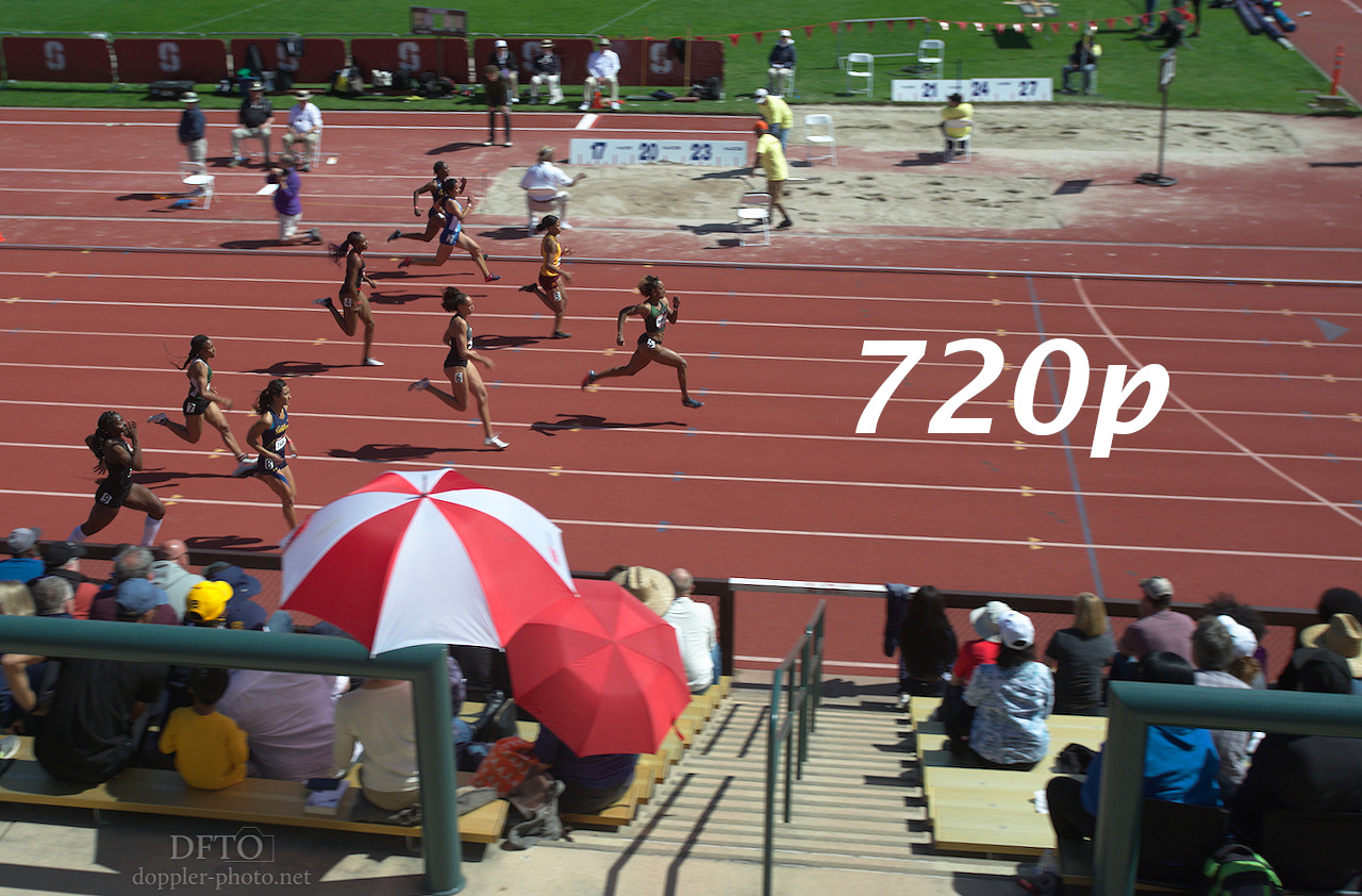 As a general rule, the white image-resolution labels on each image are the same size in each original image. The text will appear smaller when your web browser scales that image down to show it in the context of the webpage, and will appear larger when the web browser scales an image up. You can click any image below to download the full-size version so you can compare them on your own. When you do that and show each image at full size, you should see that all the labels are the same size. As you compare sharpness, an easy comparison is seeing if you can read hip numbers or bib numbers in one image but not the other.